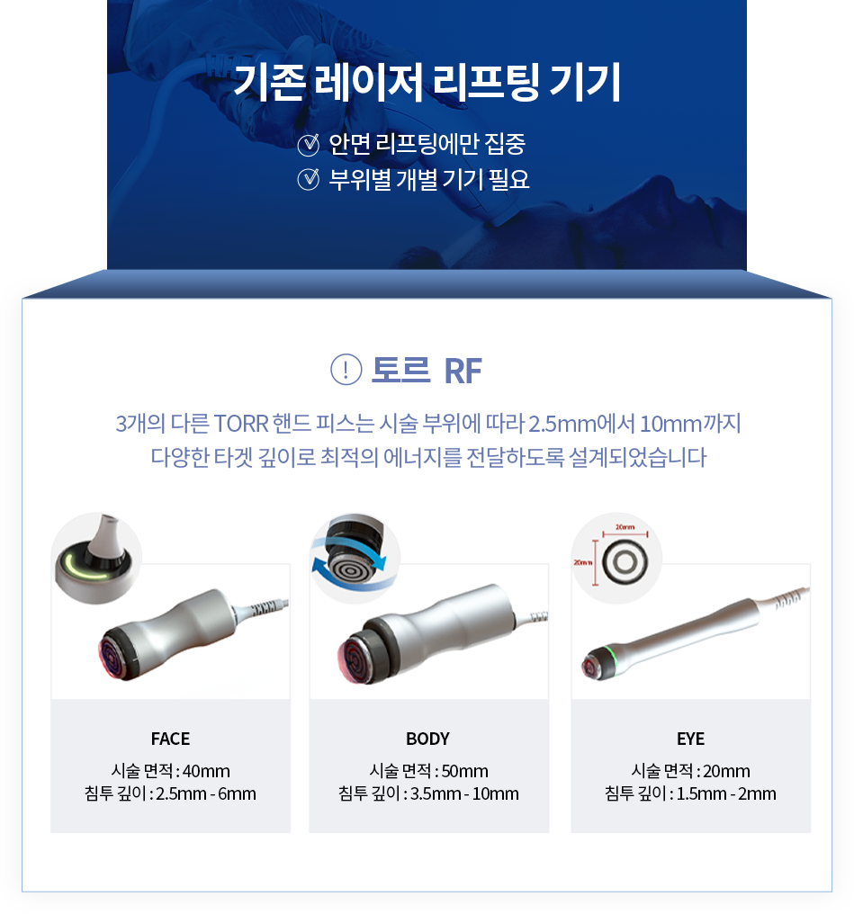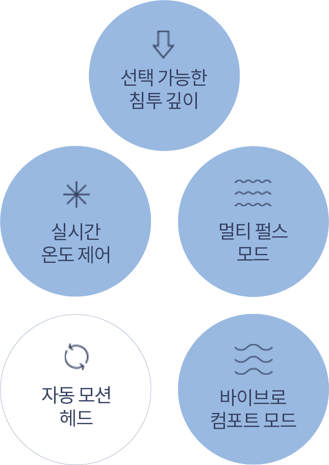 두가지 에너지 침투 깊이를 다르게 선택하면 적응증과 환자 상태에 따라 최적의 치료 효과를 얻을 수 있습니다